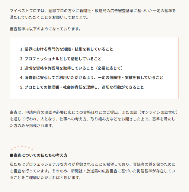 マイベストプロでは、以下のように審査基準を設けて公表しています。